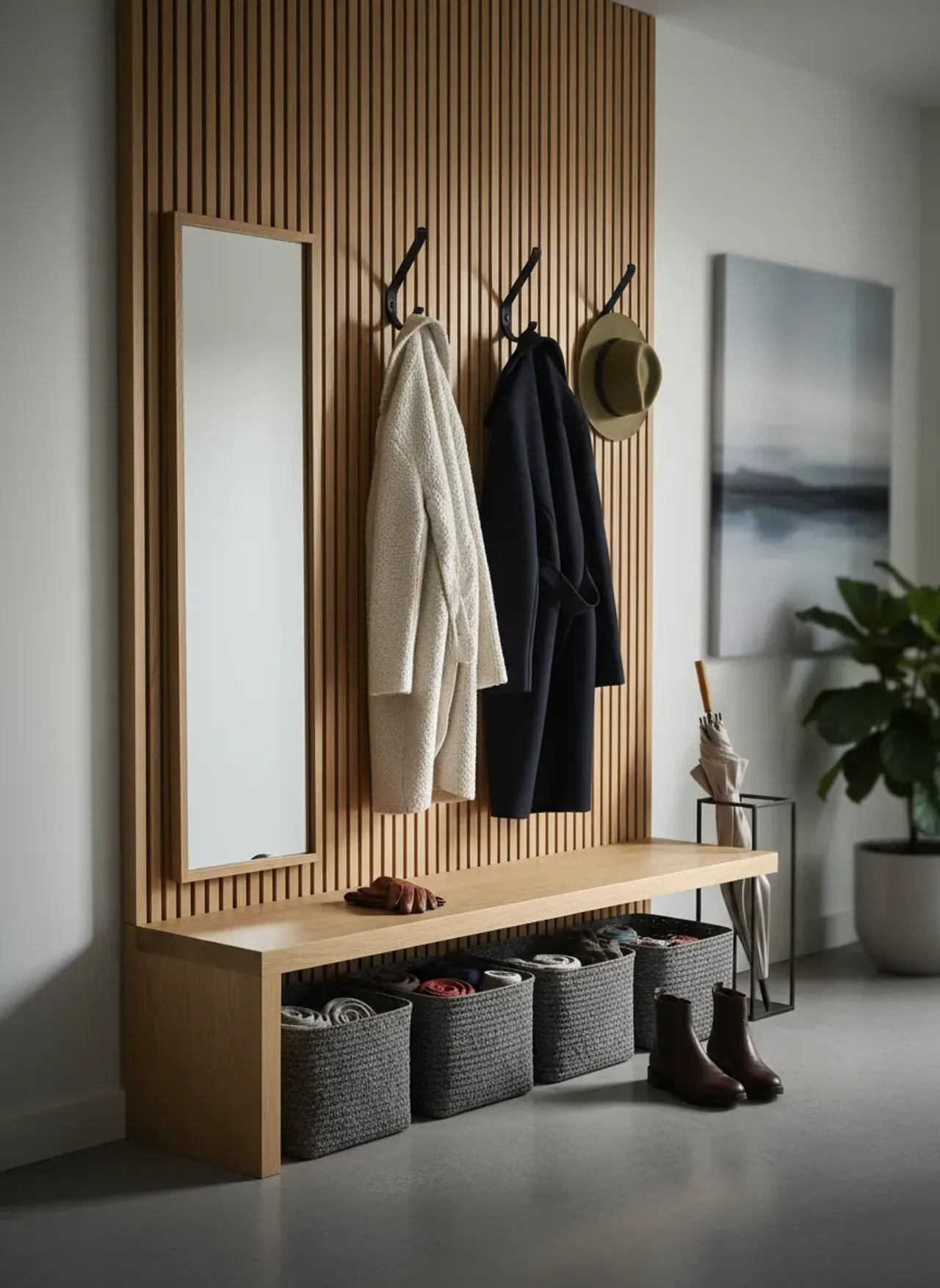 Exposed coat hooks are ruthlessly honest. They offer zero friction for the user—you walk in, you drop the coat—but they instantly become a dominant visual element in your hallway. If your aesthetic is heavily minimalist, a chaotic cluster of multicolored puffer jackets, mismatched umbrellas, and neon dog leashes will destroy the serene vibe of your entryway.