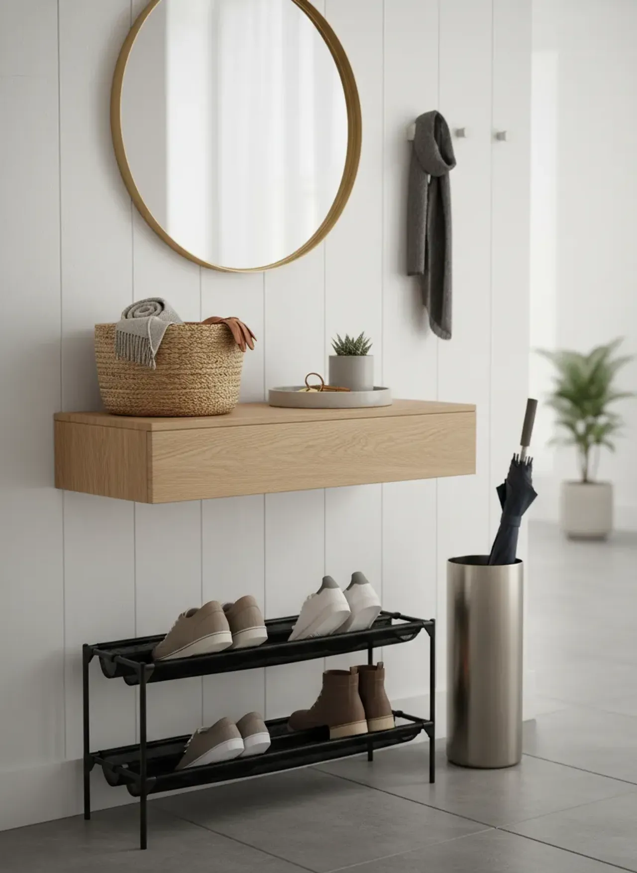 - Over-Decorating: Every decorative vase or framed photo on your entryway shelf is stealing valuable real estate from functional items. In a micro-space, the storage itself needs to be the decor. Choose pieces with beautiful wood grains, striking hardware, or architectural shapes so you don’t feel compelled to clutter them with knick-knacks.