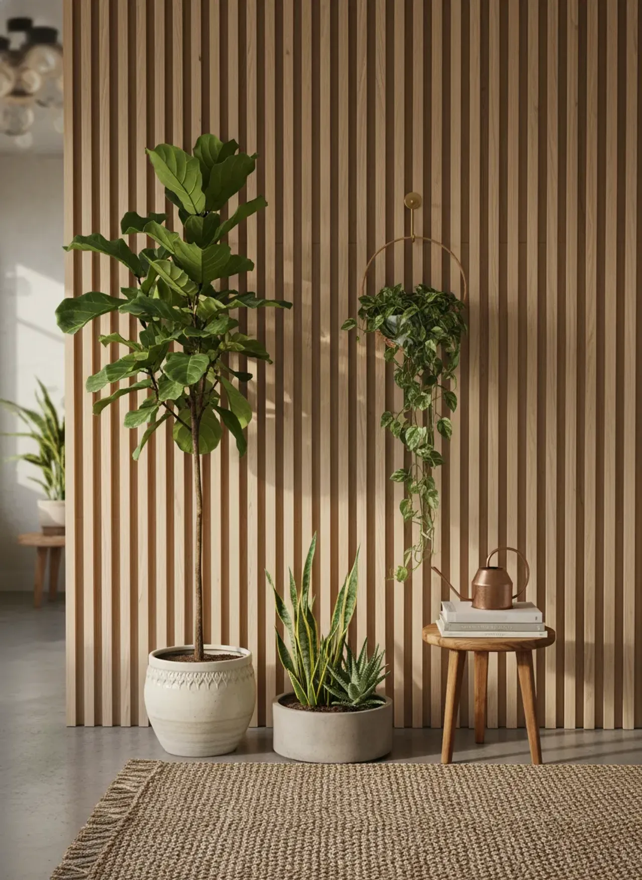 The “Jungle Clutter” Effect: More is not always better. Biophilic design relies heavily on negative space. If you cram twelve small, mismatched plants onto a console table in front of your slat wall, you destroy the architectural rhythm. The space becomes visually chaotic. Opt for one massive statement plant (like a mature Ficus) and perhaps one small trailing plant on a shelf. Let the wood breathe.